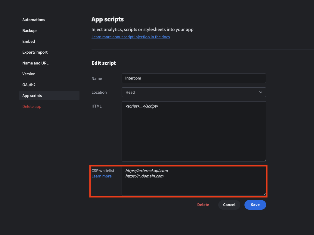This configuration is available under the "App Scripts" page in a new section titled "CSP Whitelist Domains."