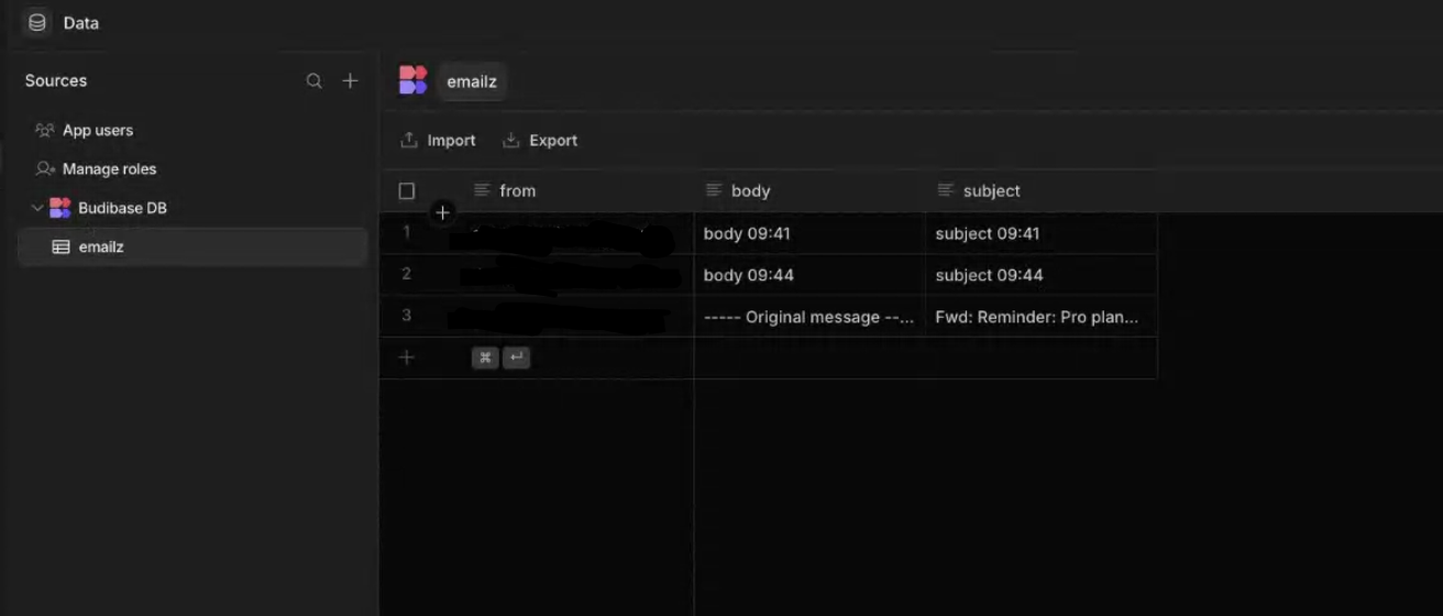 Now, each time an email is received, Budibase runs the automation and creates a new row in 'Emailz' with the sender’s email address in from and the message content in body. There may not always be a subject, but if there is it will be in subject