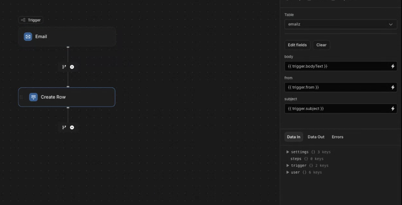 When an email is received, it will trigger the create row action which we have set up to populate our table 'emailz' based on three fields, body, from and subject. These have been selected from the Email's trigger outputs