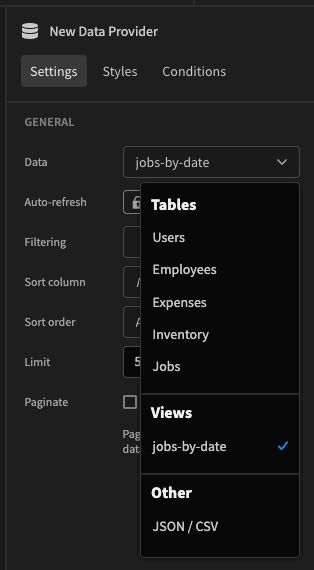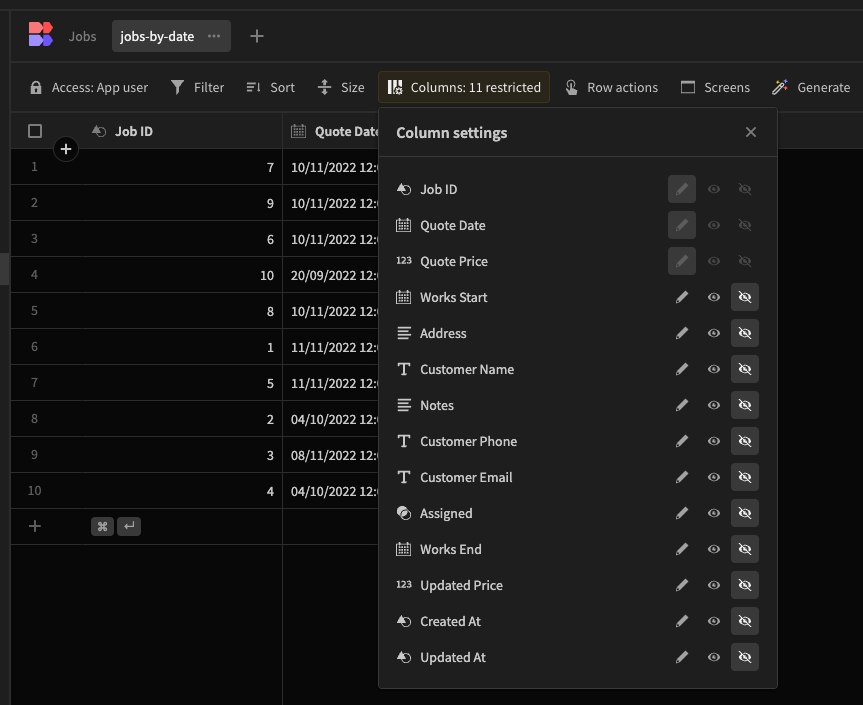 Using the Budibase Sample Data, go to the Jobs table and create a new "jobs-by-date". Set all columns as hidden apart from "Job ID", "Quote Date", and "Quote Price".