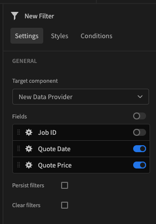 In the settings of the Filter component, set it to target your Data Provider added in Step 2, and select "Quote Date" and "Quote Price". These columns will be available for users to filter the Data Provider (and therefore the Pie Chart).