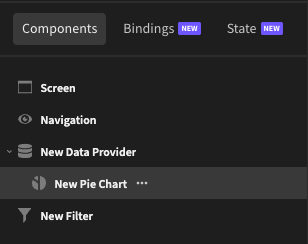 Next, head to the Design section, and add to your screen a Data Provider, a Pie Chart (nested inside the Data Provider), and a Filter component.