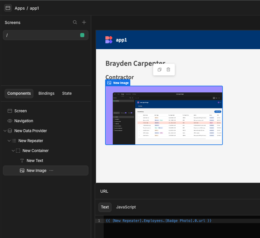 Finally, add an Image component within the repeater. Paste the below binding inside the URL setting of the image component. Using JavaScript
