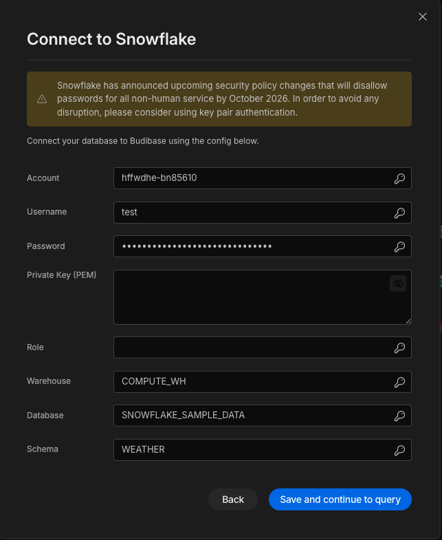 When you add a new Snowflake Data Source you will be presented with a config dialog to fill in.