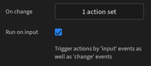 Triggers the same Actions on input events (typing, paste, barcode scans) as the value changes, rather than waiting for the change event. Available for Text, Number, BigInt, Password, and Image fields where an input event is emitted.
